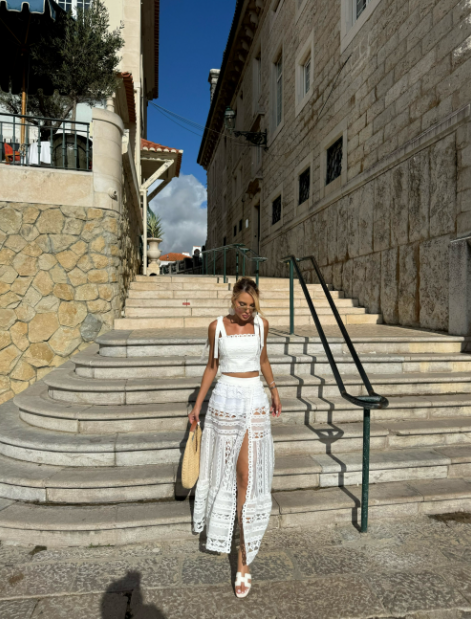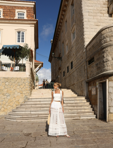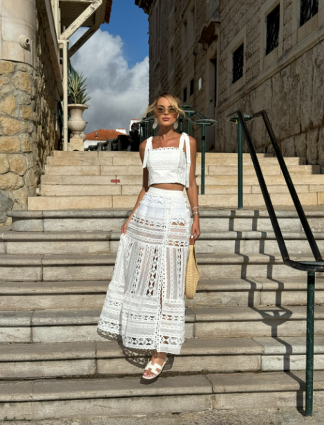 Conjunto confeccionado em patchwork de Guipir, cropped com alças para amarração, detalhe em renda de bico no busto, fechamento por zíper nas costas e forro. Saia com transparência, fenda com detalhe em renda de bico, acabamento barrado, zíper lateral, acompanha hot pants.