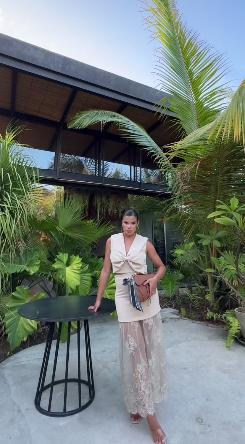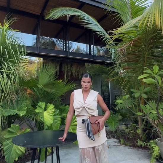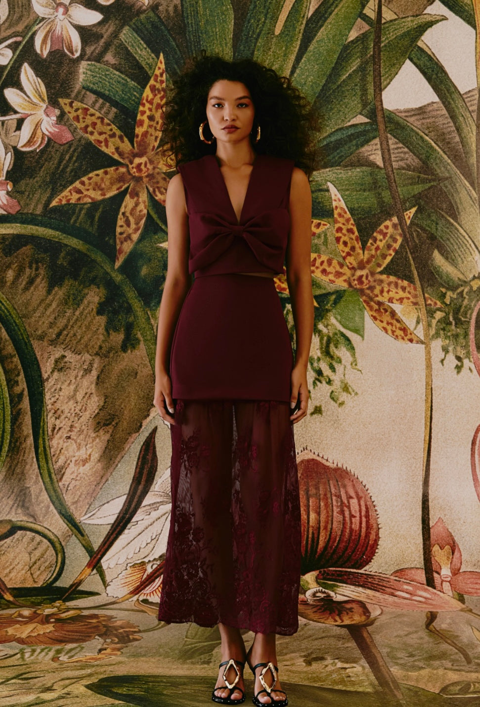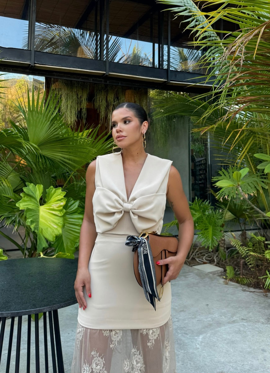 Conjunto em alfaiataria de top todo duplo com laço estruturado em busto, fechamento por zíper nas costas. Saia com zíper lateral, acompanha forro com saia em renda chantilly embutida.