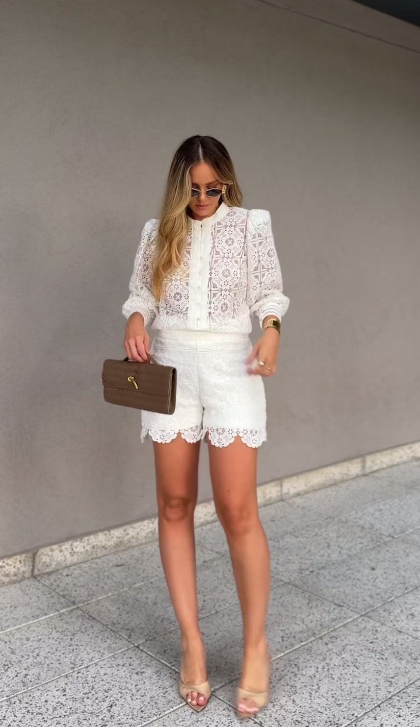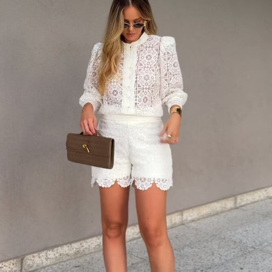 Conjunto em guipir, de camisa com manga estruturada com ombreirinha, vista, gola e punho com aviamento, fechamento por azelhas e botões. Short com acabamento em barrado, fechamento por zíper lateral e forro.