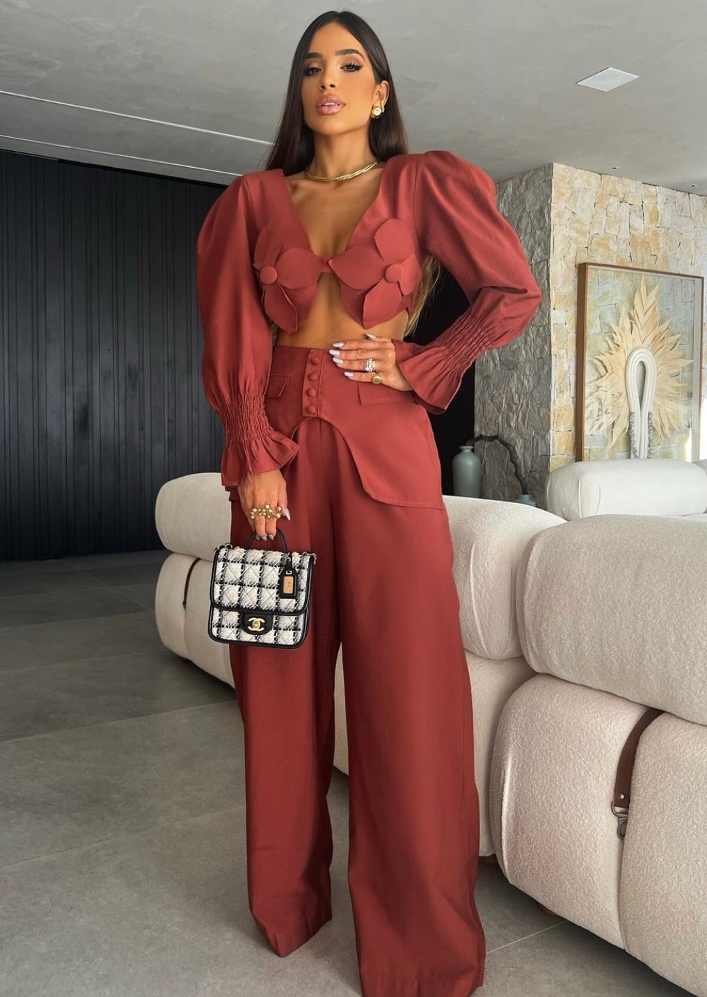 Calça com corte reto e sobreposição no cós, botões encapados e fechamento em zíper invisível.