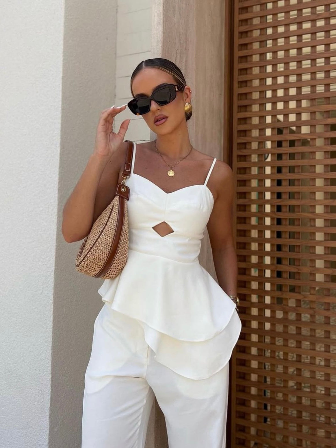 Conjunto confeccionado em crepe alfaiataria. Blusa possui babados laterais, recorte discreto abaixo do busto e alças finas com regulagem. Fechamento nas costas com lastéx e zíper metálico. Acompanha calça alfaiataria reta com bolsos faca.