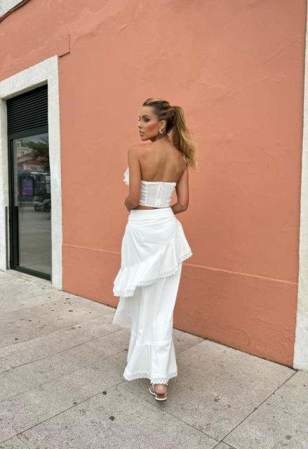 Conjunto em tricoline, de top sem alça, com renda de bico, aplicação de mandala em guipir e babadinhos. Possui lastex e fechamento por zíper nas costas; fita de silicone para maior sustentação. Saia midi com aplicação de diferentes mandalas em guipir, jabô em transpasse com acabamento em renda de bico, fechamento por zíper lateral e forro.