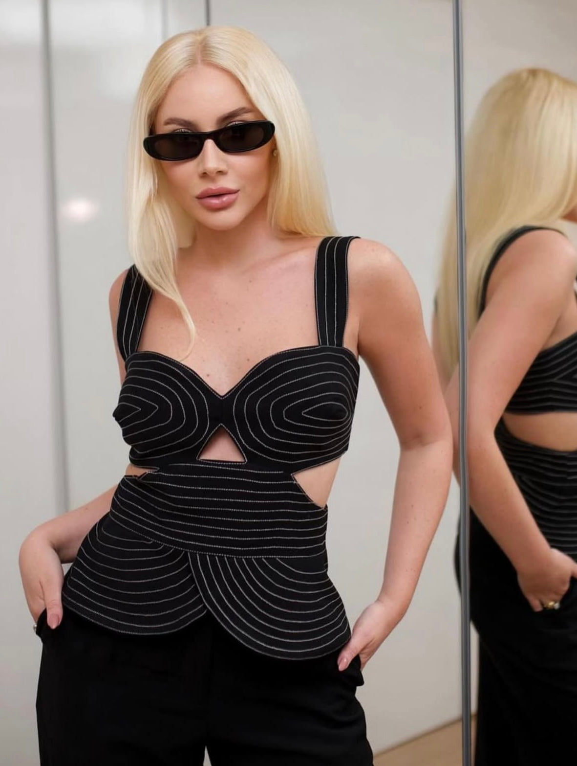 Conjunto Lolita em crepe alfaiataria. Acompanha top com pespontos, modelagem ondas e recortes discretos. Possui zíper nas costas. Calça alfaiataria modelagem reta, altura média e bolsos faca.