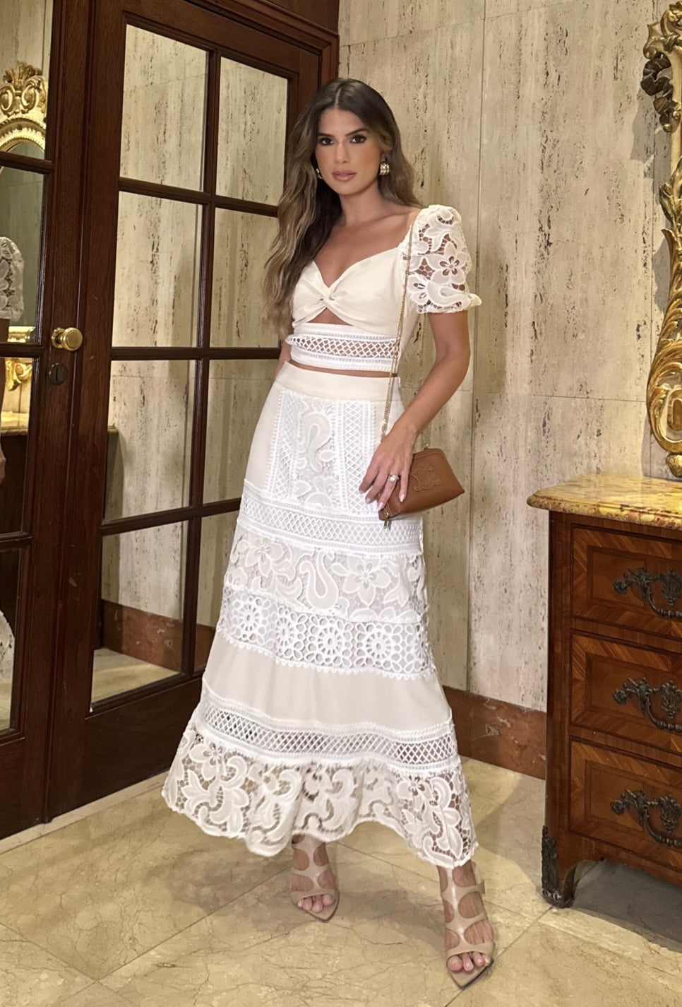 Conjunto de top em crepe, com torção em busto, manga em crepe bordado Richelieu, pala com entremeio largo vazado, fechamento por zíper nas costas. Saia midi com mix de crepe liso e crepe bordado, com zíper lateral e forro.