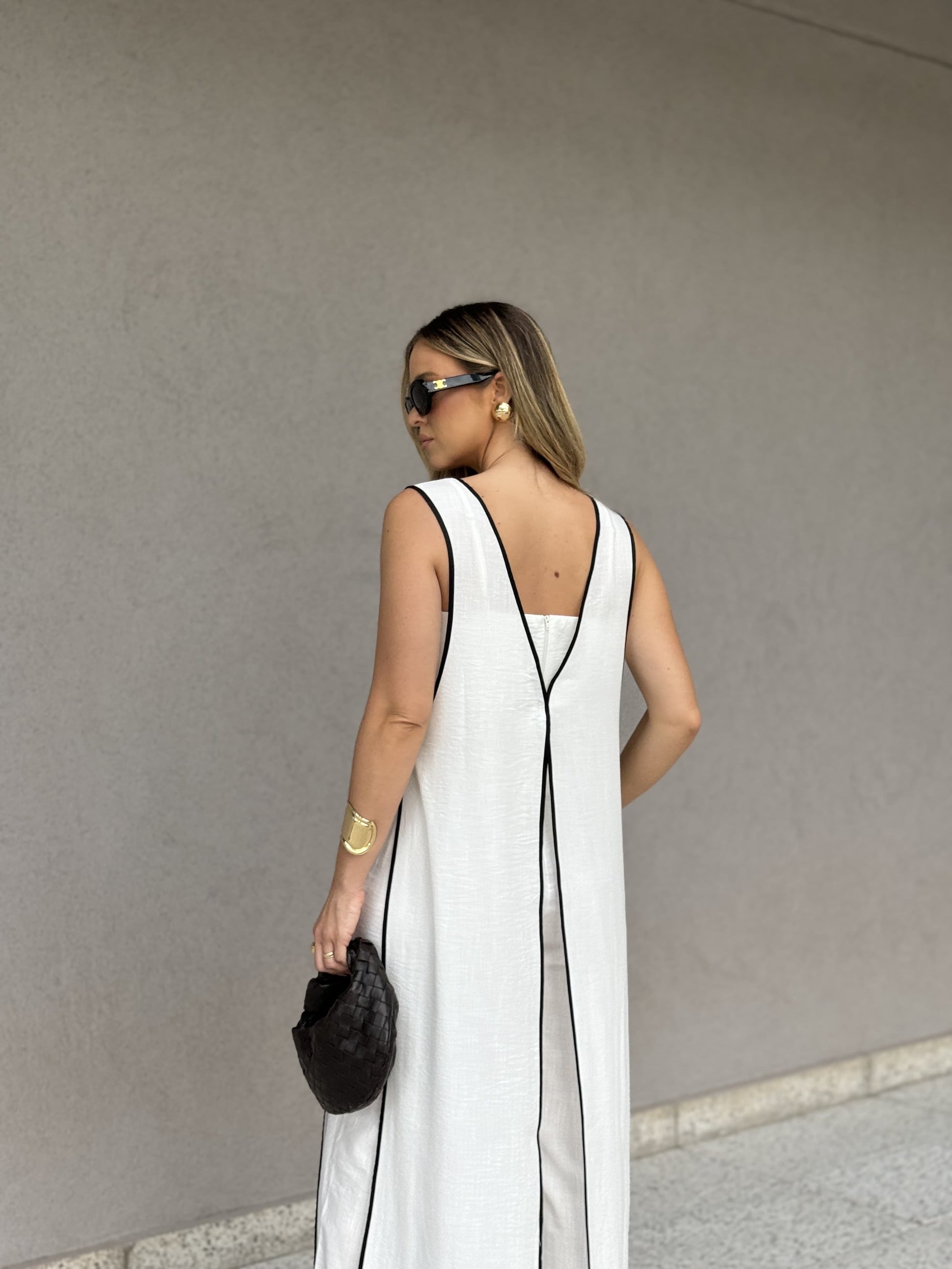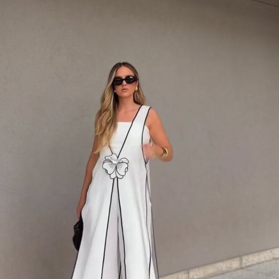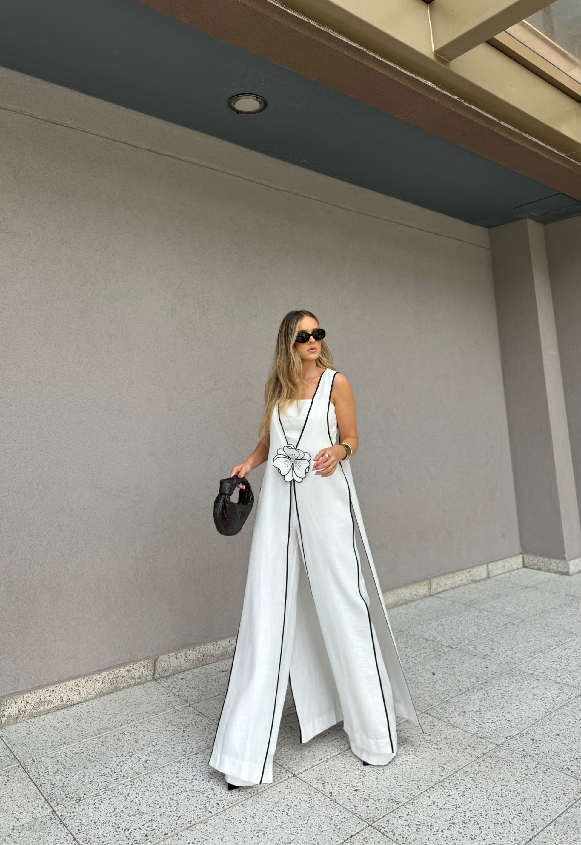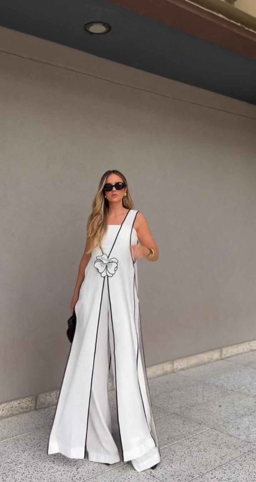 Trijunto em crepe encorpado rústico possui top de alças finas reguláveis com zíper nas costas, calça reta zíper lateral, túnica de sobreposição com aplicação de vivos em contraste e aplicação de floral bordado 3D.