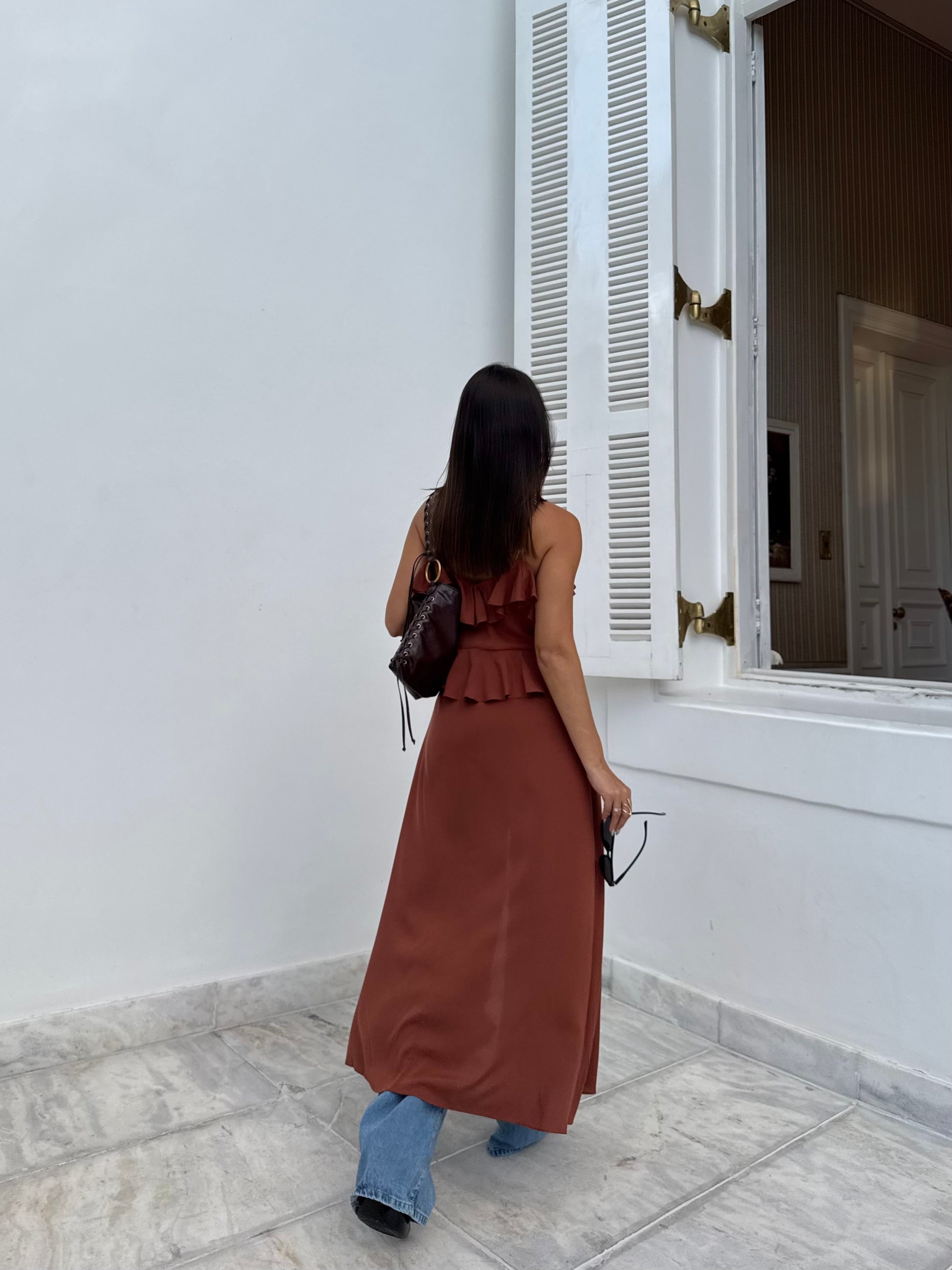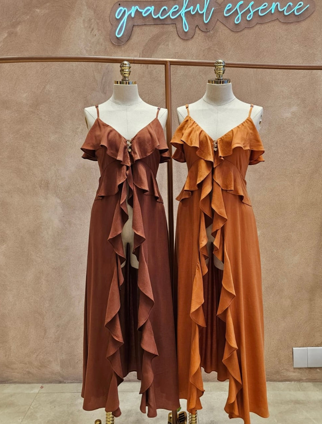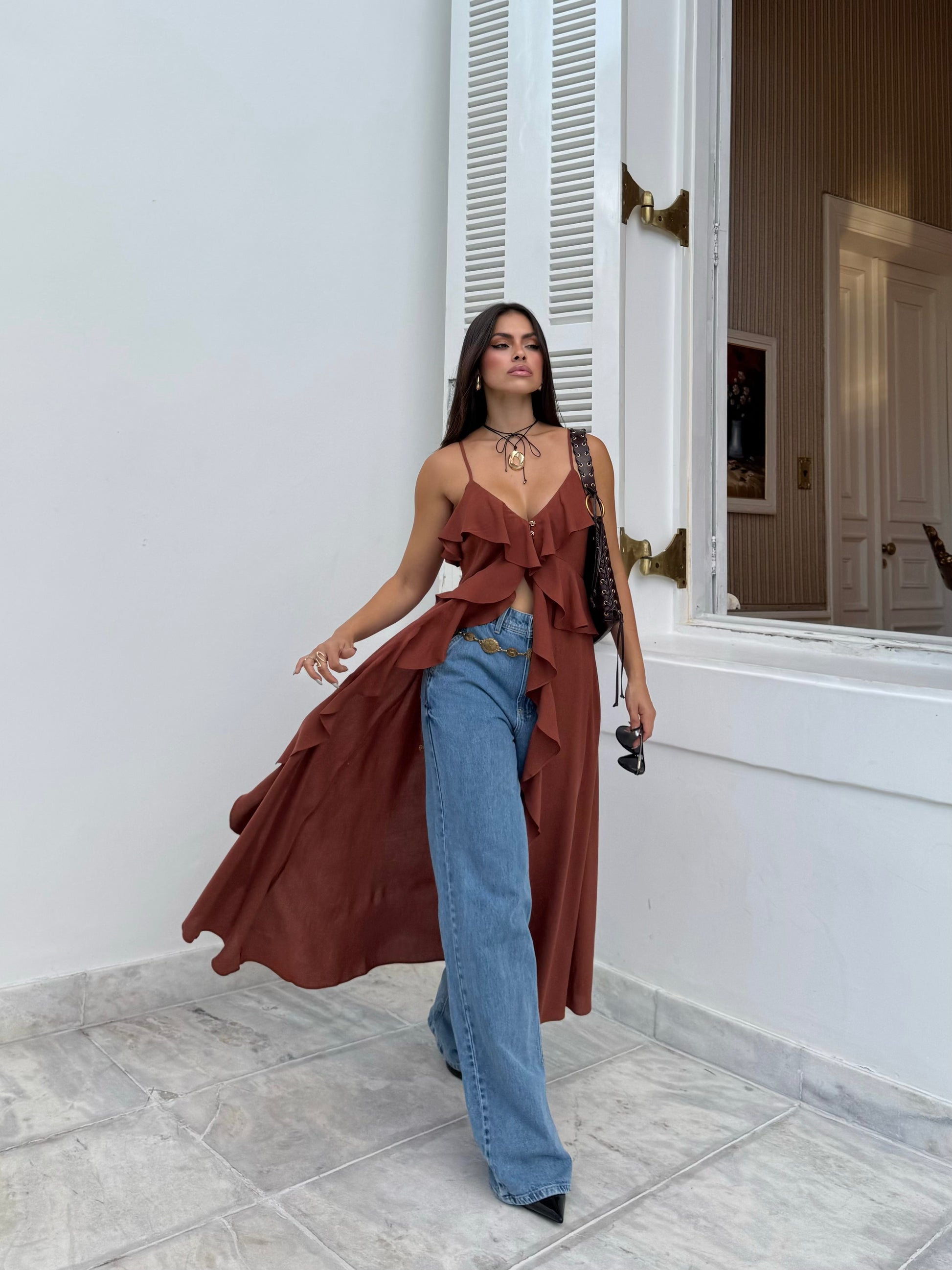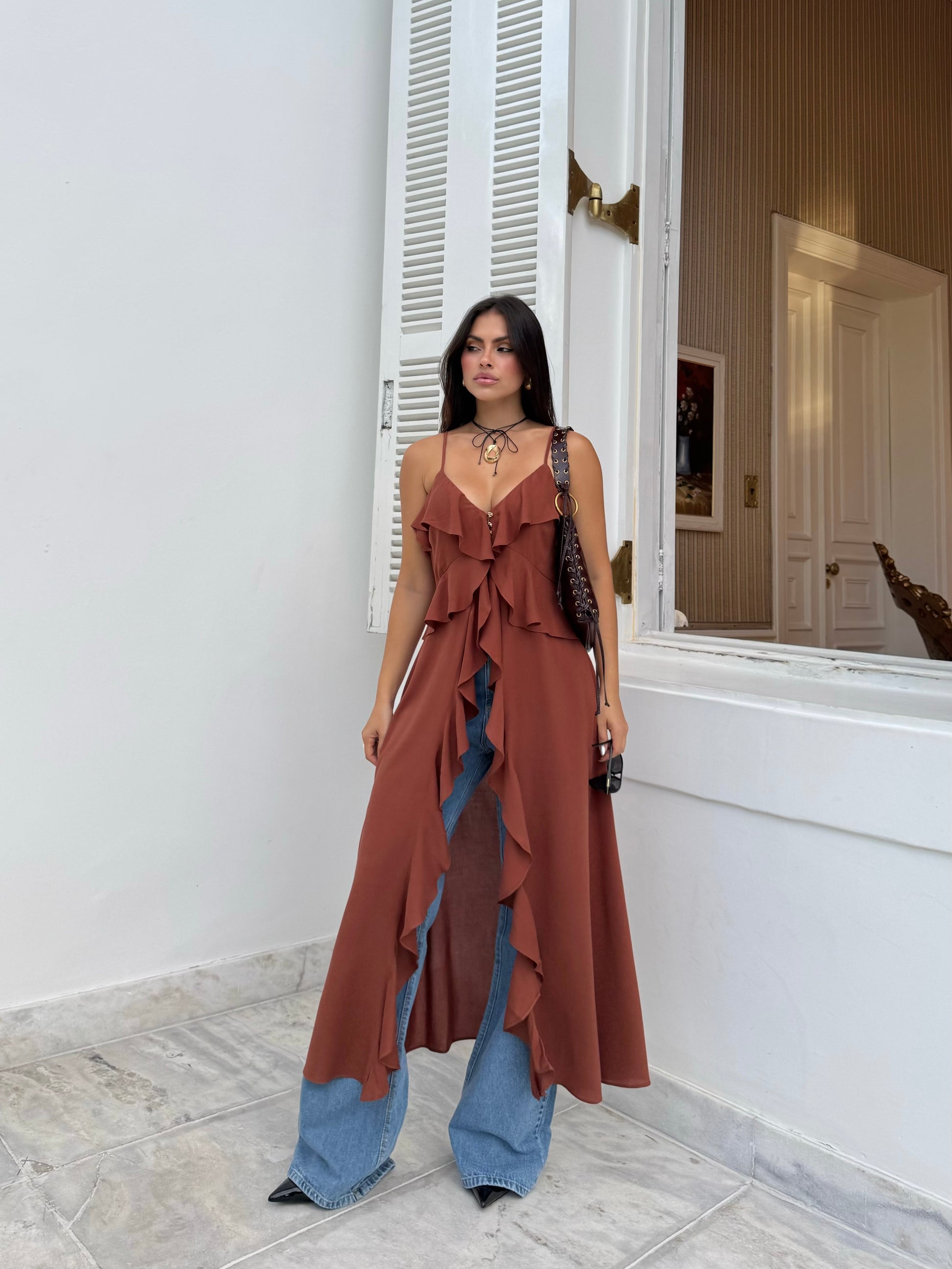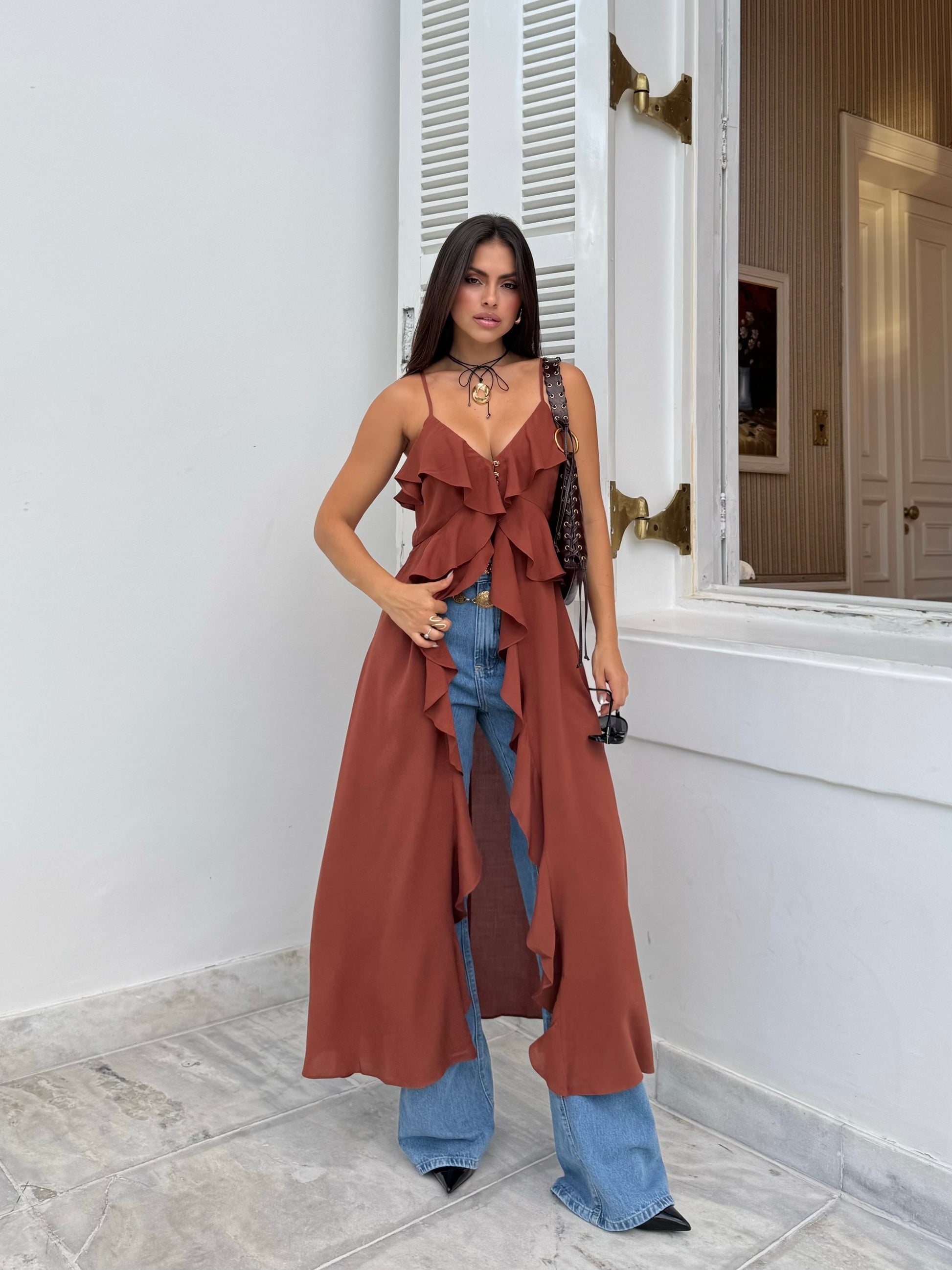 Túnica boho em viscose fluída, com alças reguláveis, babado em decote e cintura, jabô no comprimento frontal. Fechamento por botões de metal em formato orgânico.