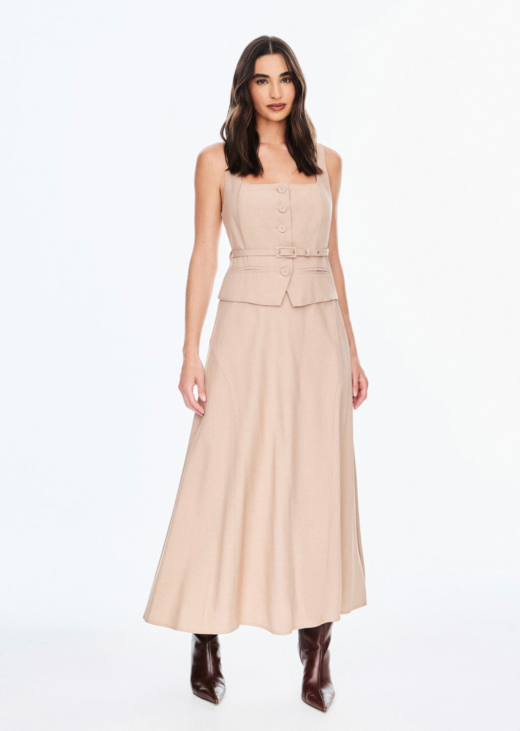Vestido midi em alfaiataria de viscose encorpada, efeito colete de alça larga, botões forrados, detalhe de vivo em bolso falso, passante, saia com elástico na cintura e zíper lateral, possui forro. Acompanha cinto estruturado, de fivela retangular