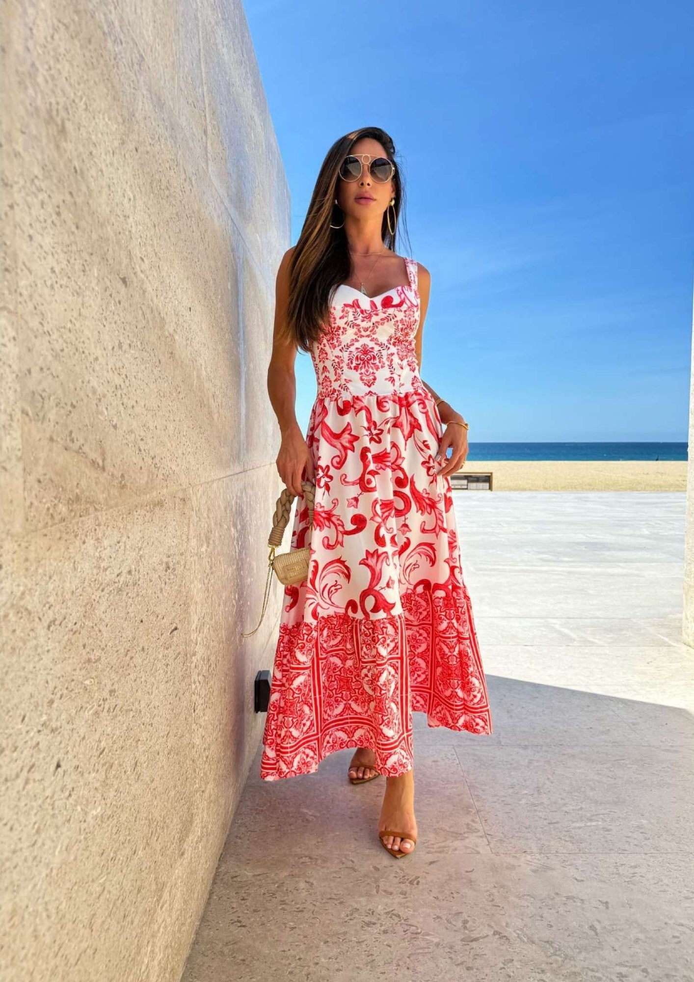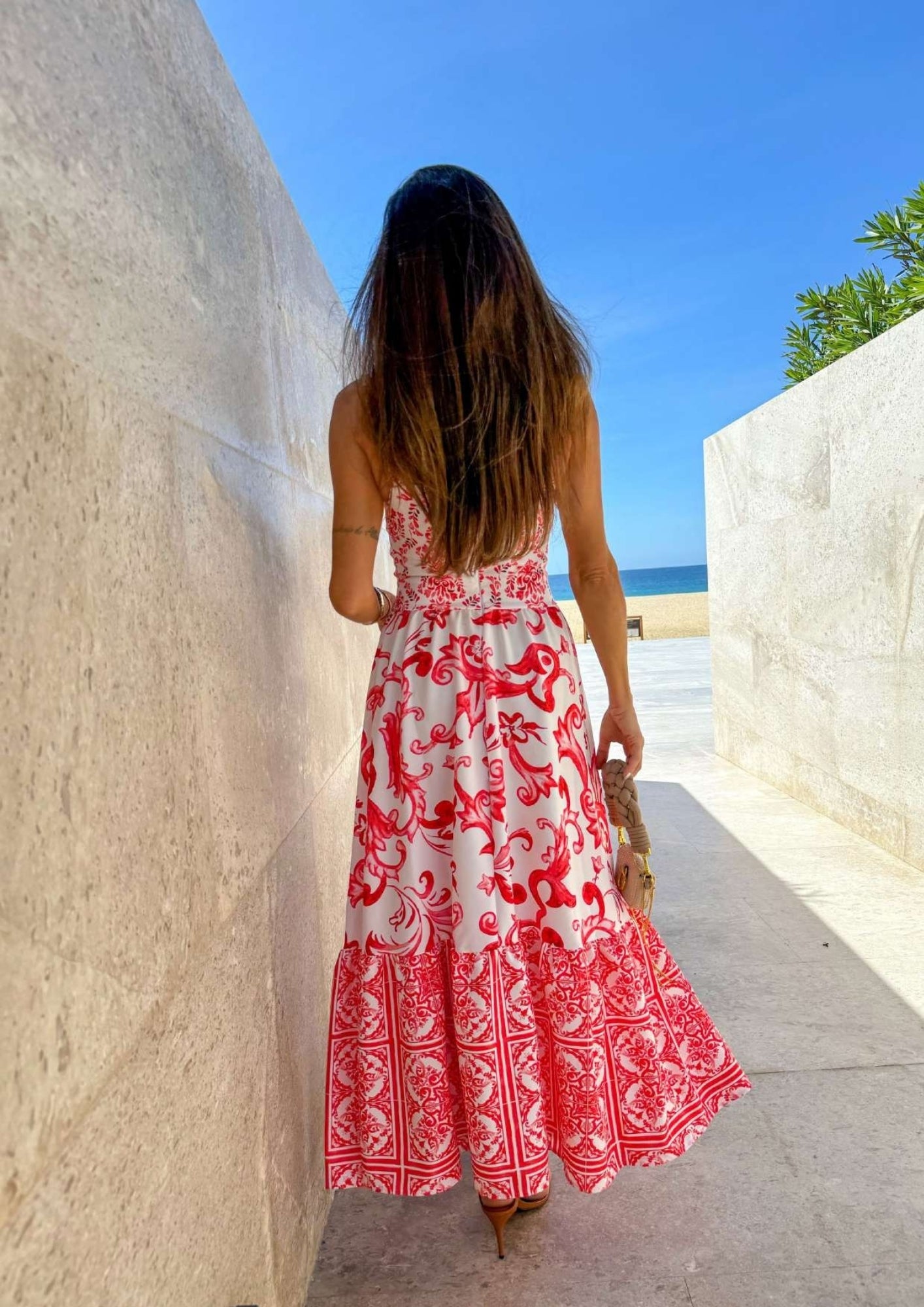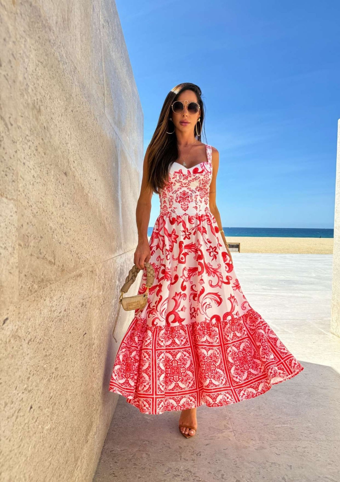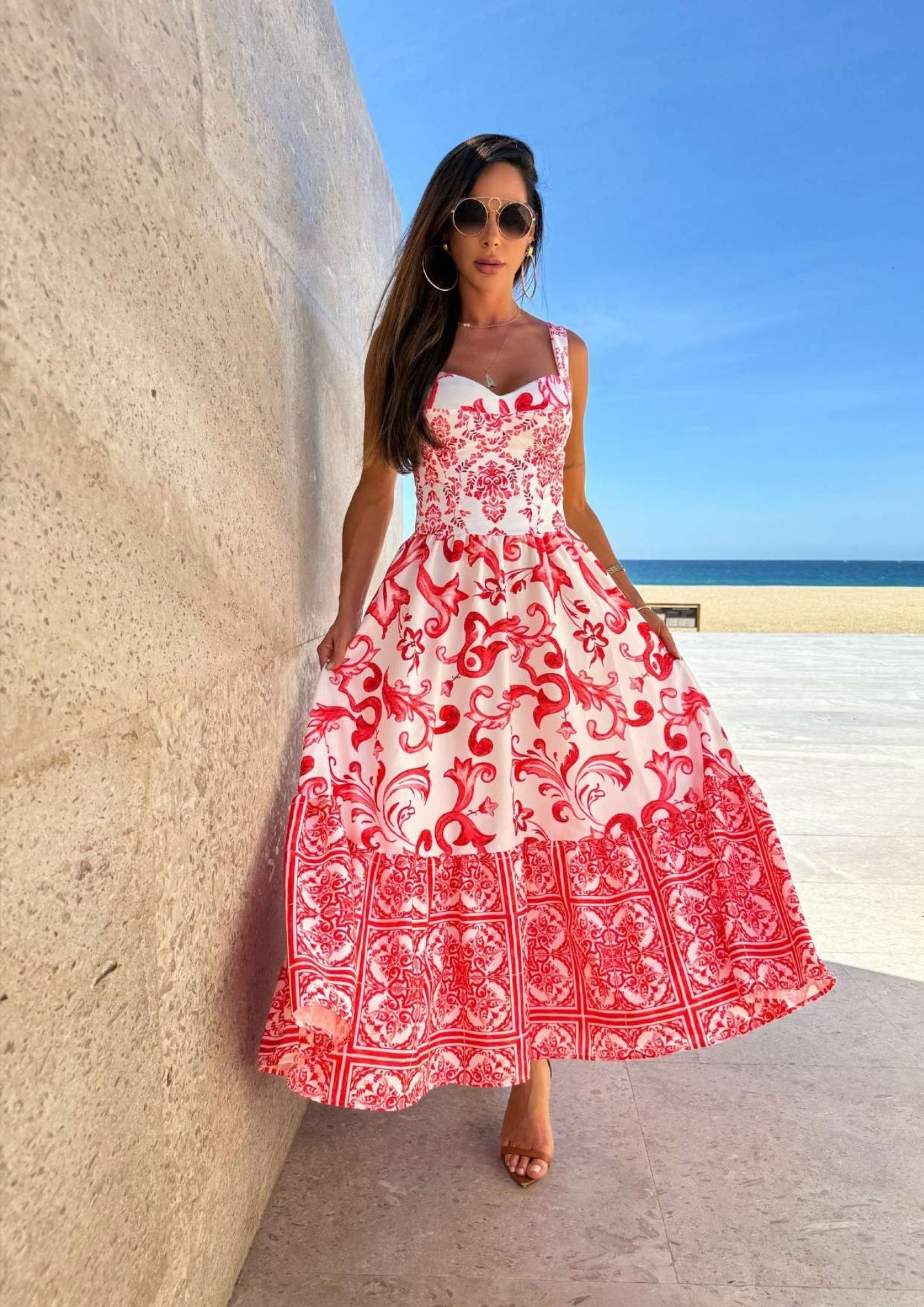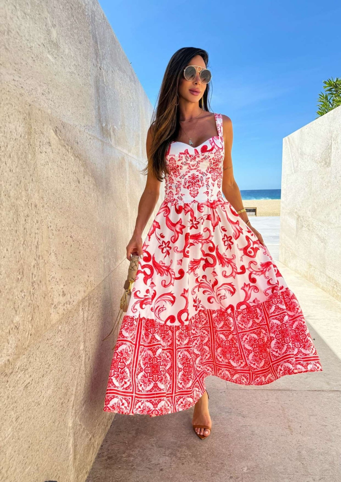Vestido midi com estampa italian style. Alça reta, corpo ajustado e saia ampla evasê com barrado. Bojo embutido e fechamento em zíper nas costas.