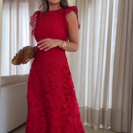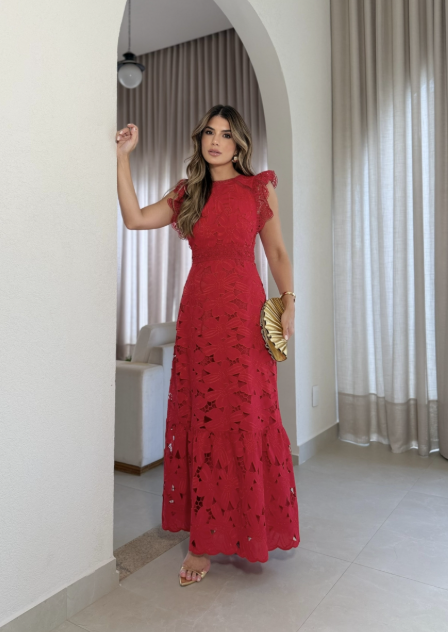 Vestido confeccionado em guipir, entremeios em busto e cintura, renda de bico na gola e na manga, saia com acabamento barrado, fechamento por zíper nas costas e forro.