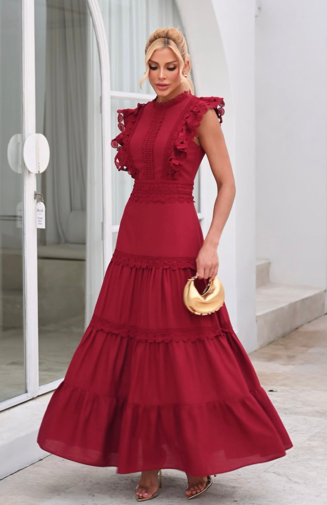 Vestido em 3 marias com fechamento em zíper nas costas e aplicações de renda guipure.
