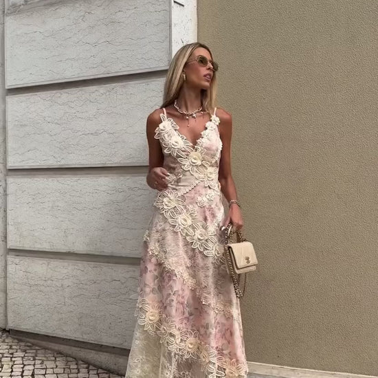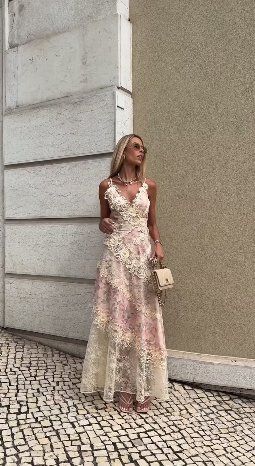 Vestido em linho misto com estampa exclusiva, de alça fina regulável, com aplicações de rendas guipir e florais 3D